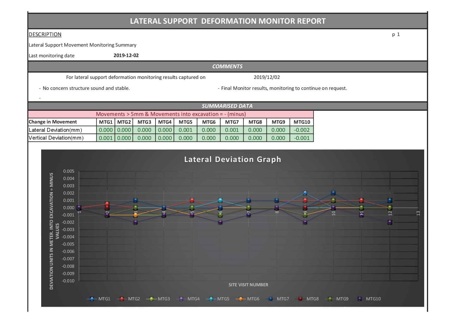 A niche and precise surveying skill implemented when a concern arises on the structural performance of any given structure. Using baseline measurements and comparing subsequent measurements taken over a period of time one can analyse deviations and determine if remedial work is to be implemented to maintain sound structural conditions.